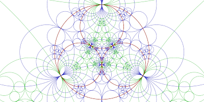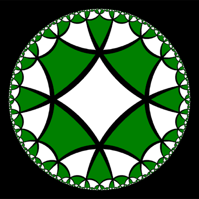 Hyperbolic geometry is a space where the angles of a triangle add up to less than 180 degrees. The other kinds of geometries are Euclidean (angles add to 180 degrees) and spherical (angles add to more than 180 degrees). If you try to pack four dodecahedra around an edge in Euclidean or spherical space, they don't fit because angles are too big. But in hyperbolic geometry, you can make them fit.