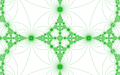 Hyperbolic space can't fit into our normal Euclidean space, so this is a model of hyperbolic space called the Poincaré Ball model. The infinity of hyperbolic space is compressed to the size of a ball, and as you might imagine, that results in some distortion. Dodecahedra appear smaller and smaller as they approach the spherical surface of the ball, but the dodecahedra are all identical in hyperbolic space. Although visually warped, the ball model preserves all angles: it is "conformal".